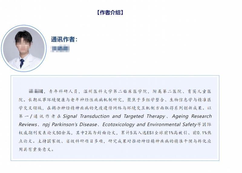 在介绍其作为通讯作者发表的一篇期刊论文公众号上,作者介绍一栏写到,该学生“以第一/通讯作者在国际权威期刊发表论文50余篇,其中2篇为封面论文,累计5篇入选ESI全球前1%高被引、前0.1%热点论文。主持国家级、省级科研项目多项,研究成果对推动神经精神疾病的精准干预与转化应用具有重要意义。”